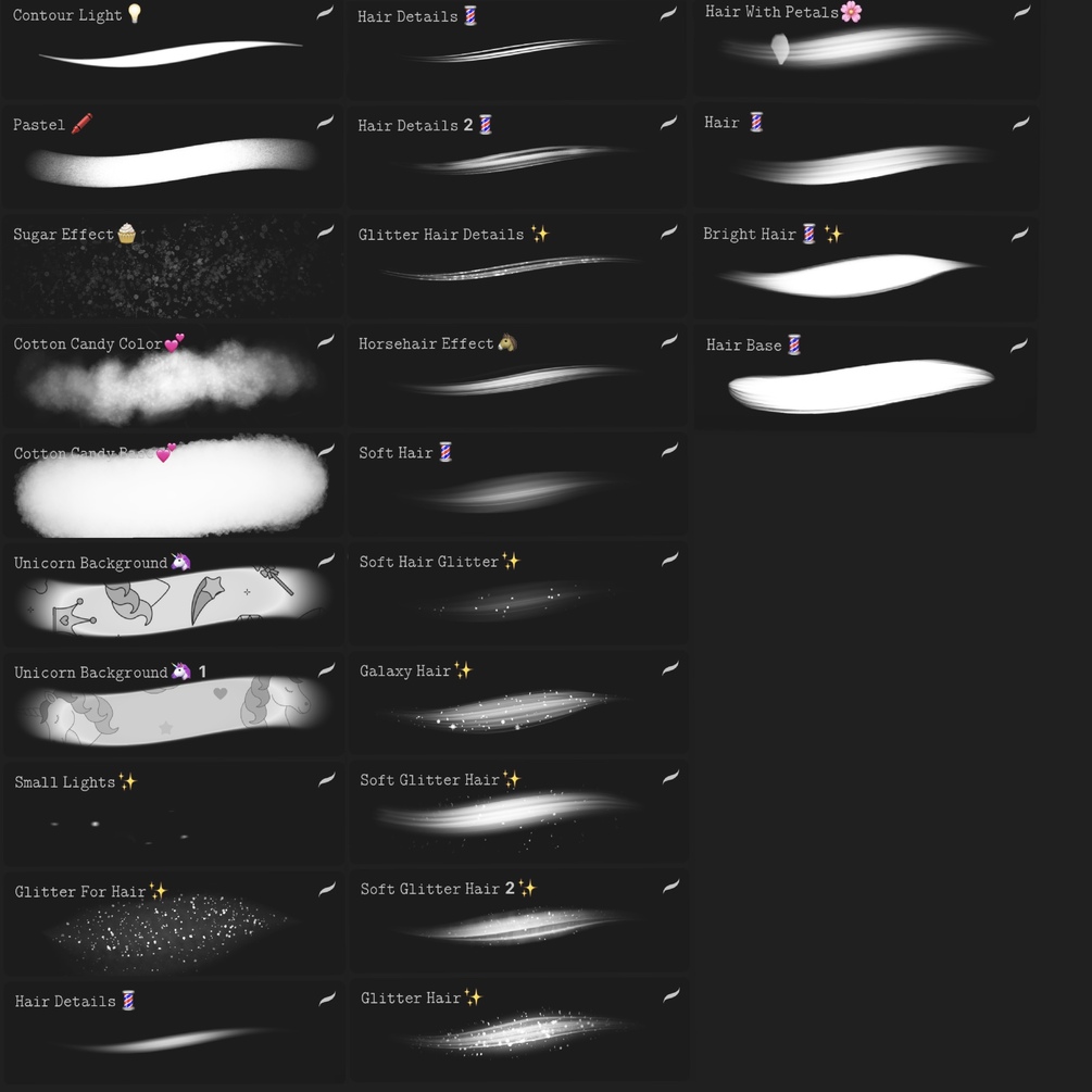 3 Cotton candy brushes, 1 brush pastel for drawing , 15 hair brushes, 2 unicorn backgroung,1 contour light,1 small lights and 1 glitter for hair